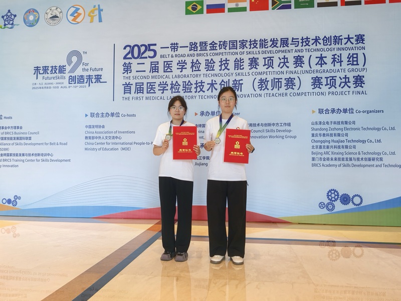 8 月 8 日至 10 日,“一带一路” 暨金砖国家技能发展与技术创新大赛医学检验技术相关赛项在九江学院同期举行,其中首届医学检验技术创新赛项(本科教师组)与第二届医学检验技术赛项(本科学生组)分别开赛。此次大赛吸引了全国60 余所 985、211、双一流高校的 240 余名师生同台竞技,我校医学检验学院师生双线出击,斩获多项荣誉,教师组王旭荣获一等奖金奖,王春明、黄李文惠获三等奖铜奖,孙梦洋、王蕊、姜珊摘得优秀奖,我校斩获“最佳组织奖”。学生组医学检验技术专业181班雷璐瑶(德馨书院)与190班甄凤月(崇德书院)共同斩获二等奖,其指导教师孙梦洋、王春明获“优秀指导教师奖”,我校获“优秀组织奖”。我校创河南省(四所参赛院校中唯一民办高校)及全国民办高校最佳成绩。