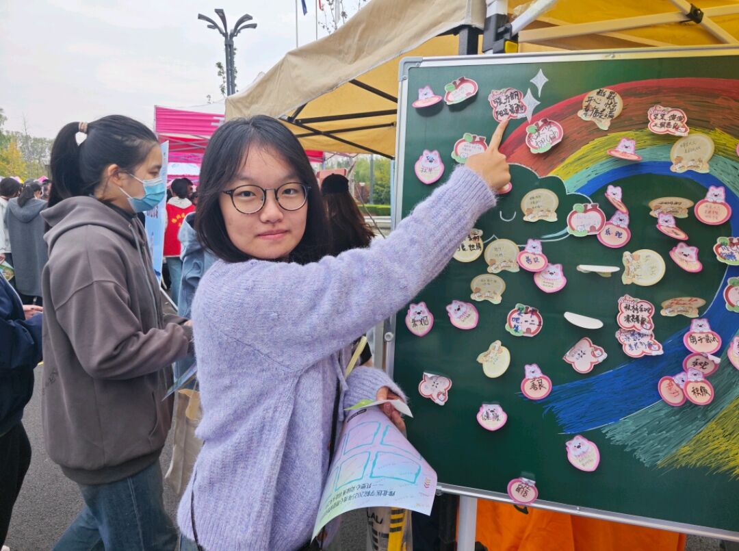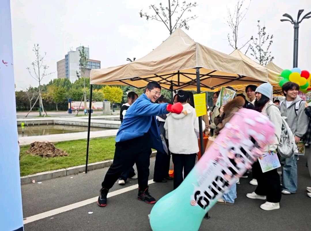 在“情绪释放拳击馆”区域,不少学子驻足停留。活动累计吸引150余名学子参与,共收集200余张写满烦恼的便利贴。大家拿起便利贴,认真写下近期的坏情绪或烦恼根源 ——“考试压力大”“和家人产生小矛盾”“对未来感到迷茫”,随后将便利贴贴在拳击靶上,戴上拳击手套,伴着轻快的背景音乐挥拳击打。