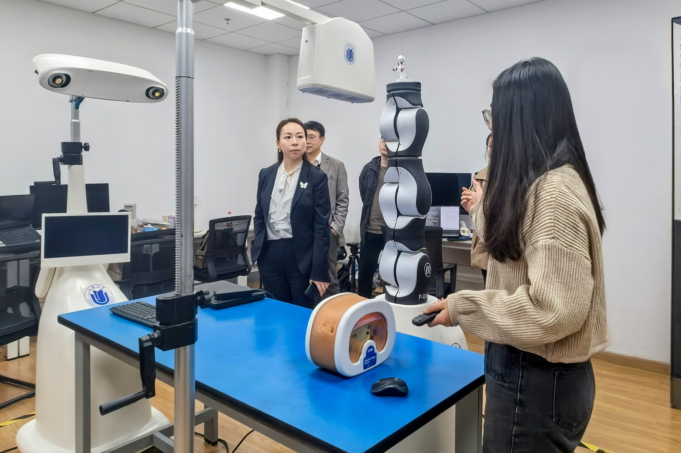 当日下午,一行访问上海大学上海机器人研究所。双方围绕医疗机器人技术研发、学生工程素养提升、实习实践基地共建等内容开展座谈交流。李琼强调,现代医学发展日益依赖工程技术的支撑,与高水平工科机构合作,有助于拓宽医学人才的学科视野,增强就业竞争力,拓展职业发展路径。
